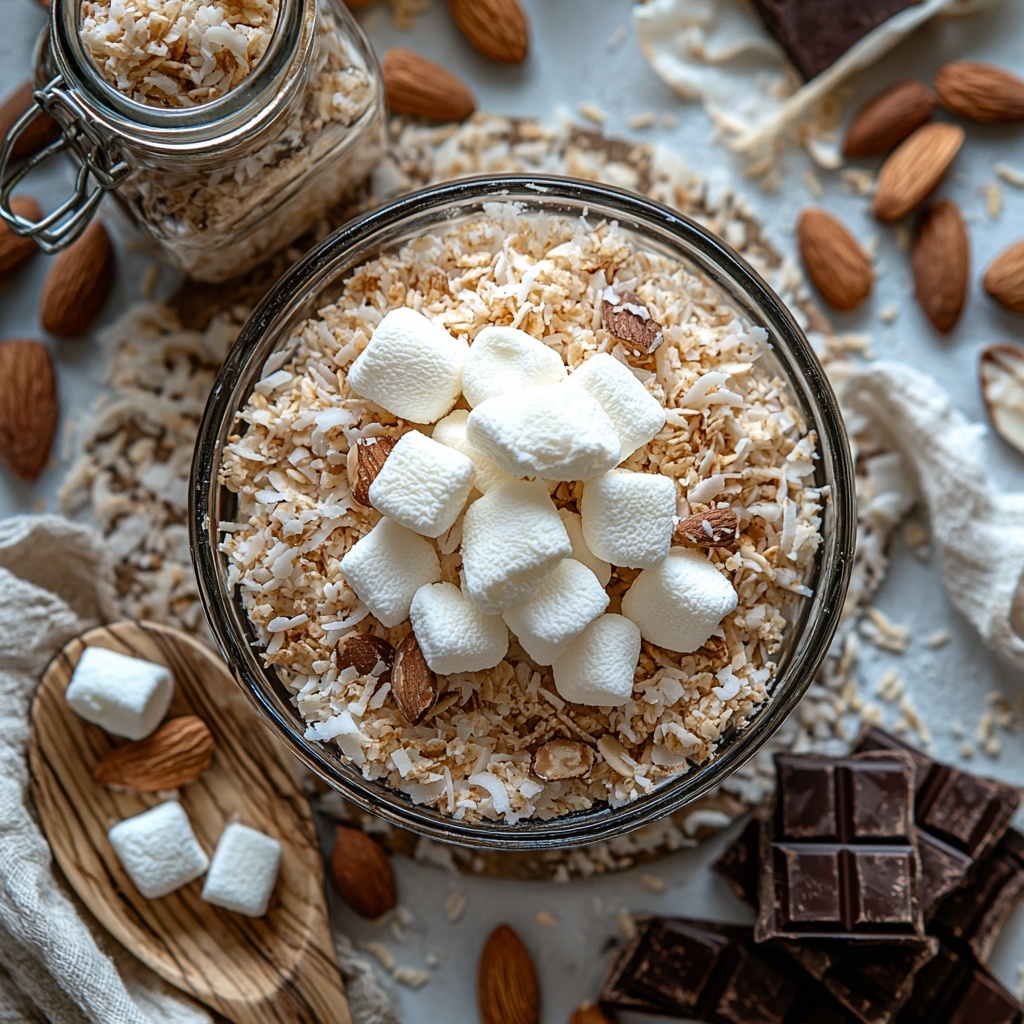 Start by preheating your oven to 375°F. Spread your shredded coconut and sliced almonds on a baking sheet and toast for about 6 to 10 minutes. Watch carefully—the goal is a light golden color that hints at toasty, nutty goodness without burning. This step unlocks amazing flavors you won’t want to skip.