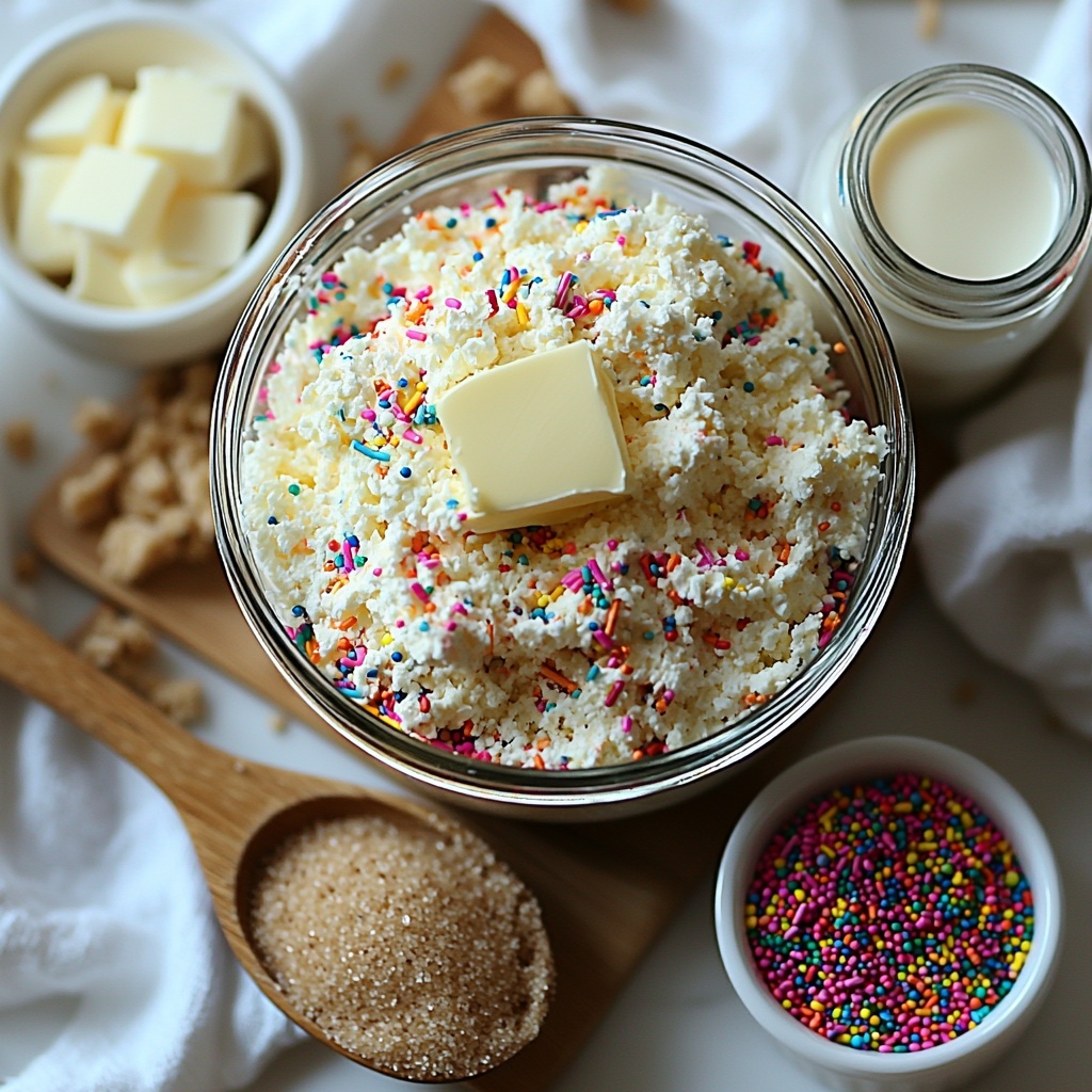 Regular flour isn’t recommended here because the cake mix contains leavening agents and flavorings that give this recipe its signature birthday cake taste and texture. If you must substitute, look for a gluten-free or heat-treated alternative, but the classic funfetti flavor won’t be the same.