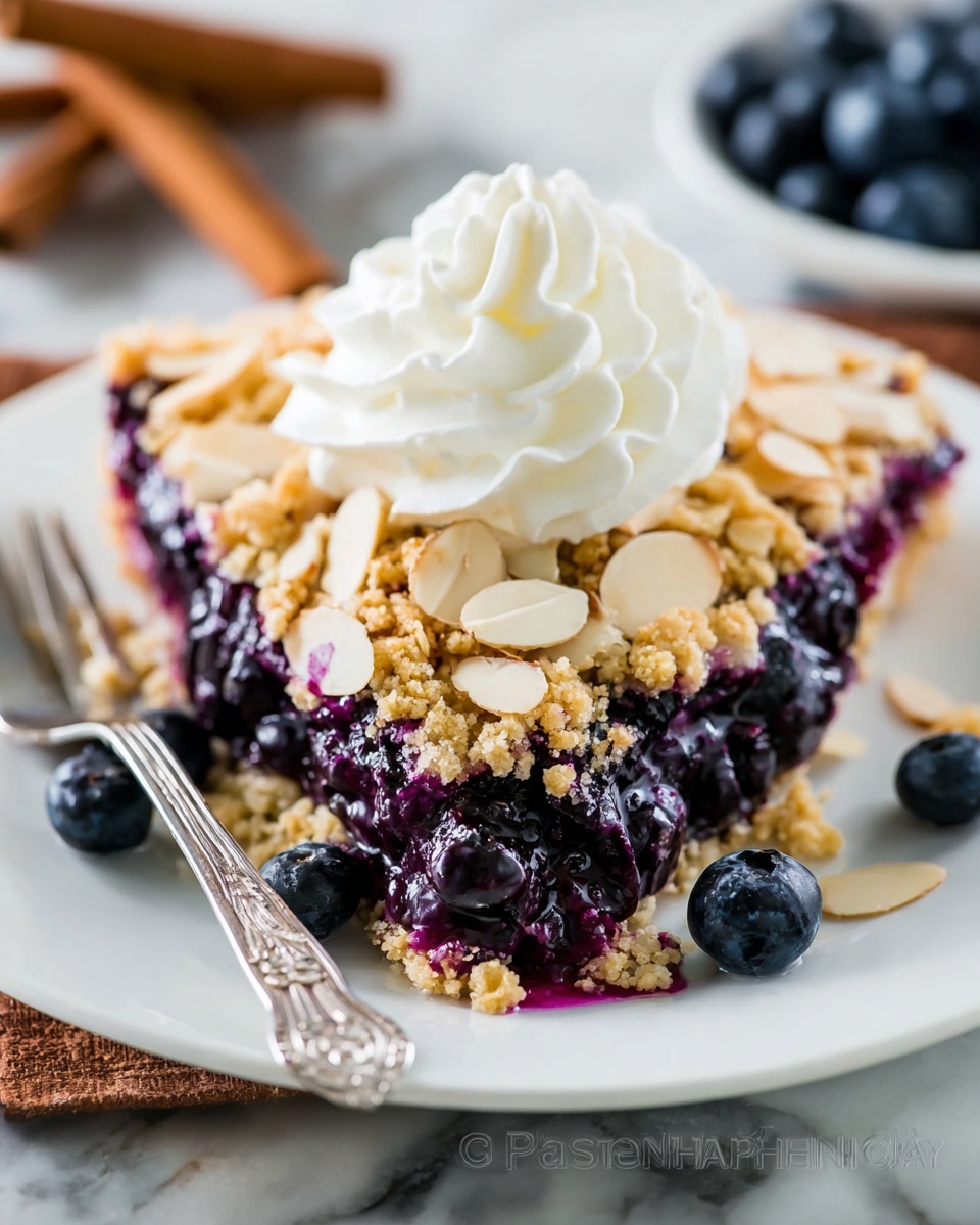Spread this mouthwatering topping over the blueberry layer evenly, making sure every inch is covered. Sprinkle the remaining almonds on top for an extra golden, crunchy finish. Bake at 350ËšF for about 40 minutes until the blueberries bubble enticingly around the edges and the crumble (plus almonds) turns a gorgeous golden brown. Now for the challenging part: let the crumble rest for at least 15 minutes after baking. This pause allows the filling to thicken slightly, making every spoonful a perfect balance of juicy fruit and crisp topping.