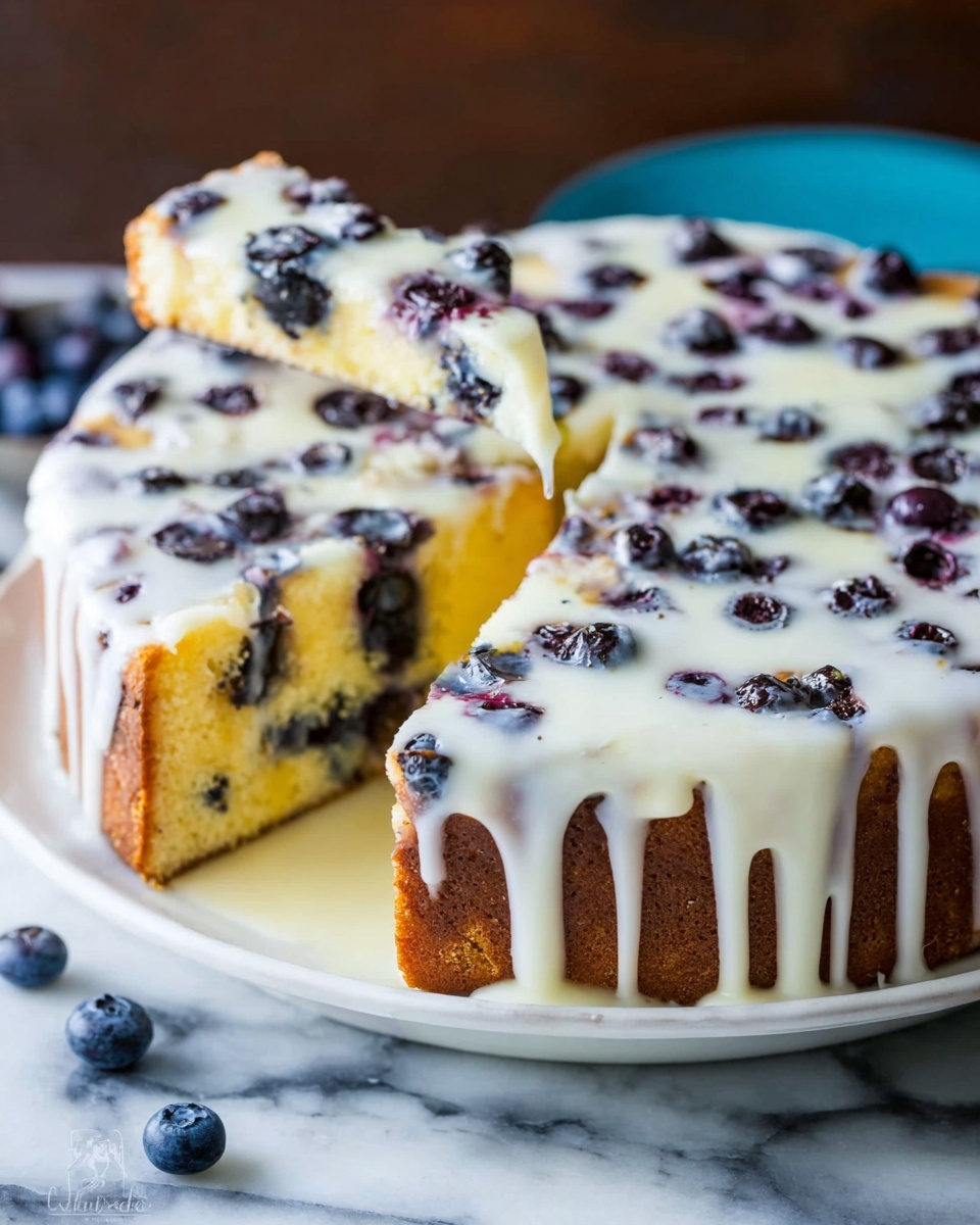 While the cake cools, mix together the powdered sugar and fresh lemon juice until smooth. Drizzle this bright, tangy glaze over the cooled cake just before serving to add a sweet, citrusy finish that complements the blueberries beautifully.