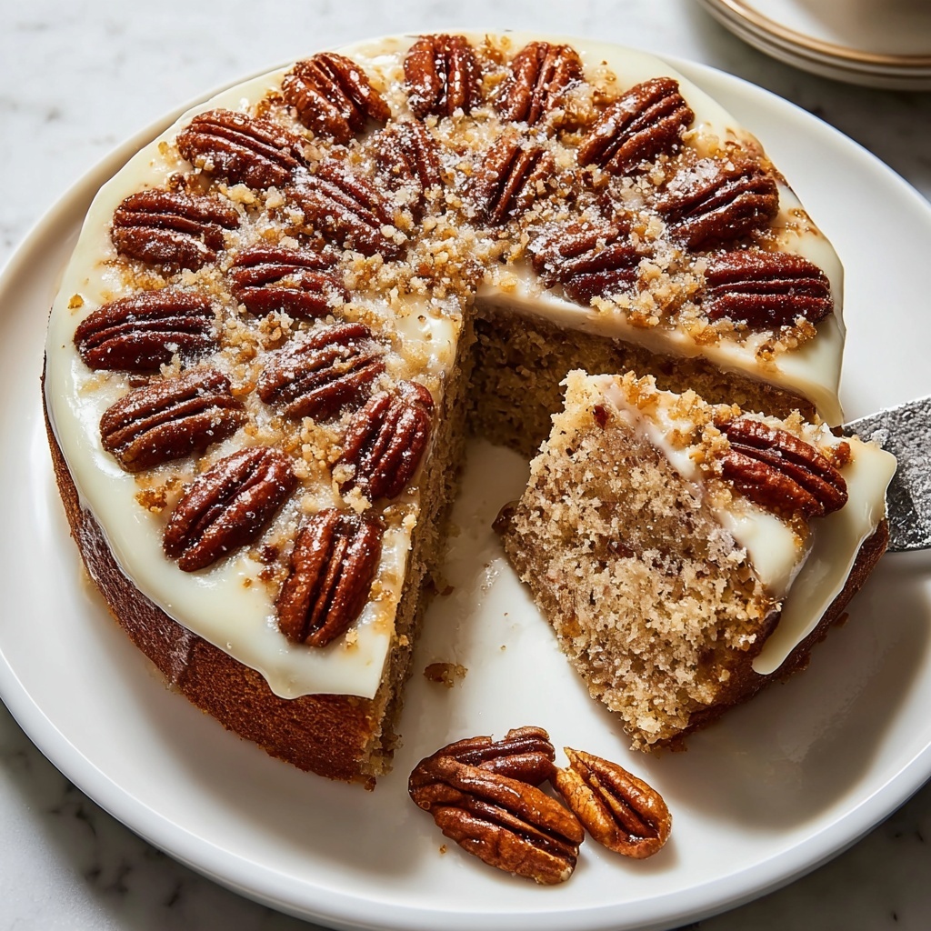 A classic cream cheese frosting or a brown butter frosting complements the cake’s nutty richness beautifully, adding creamy tang and depth without overpowering the pecan flavor.