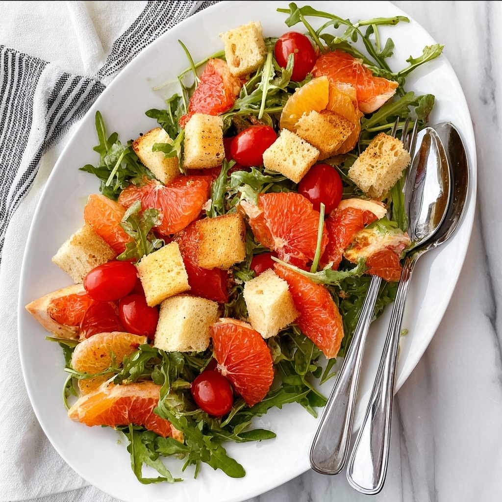 In a large bowl, gently toss together the baby arugula, Cara Cara orange slices, thinly sliced shallots, cherry tomatoes, and the stale bread pieces. The bread can be slightly toasted if you prefer it crispier, but traditionally stale bread works best as it soaks up the dressing without getting too mushy.