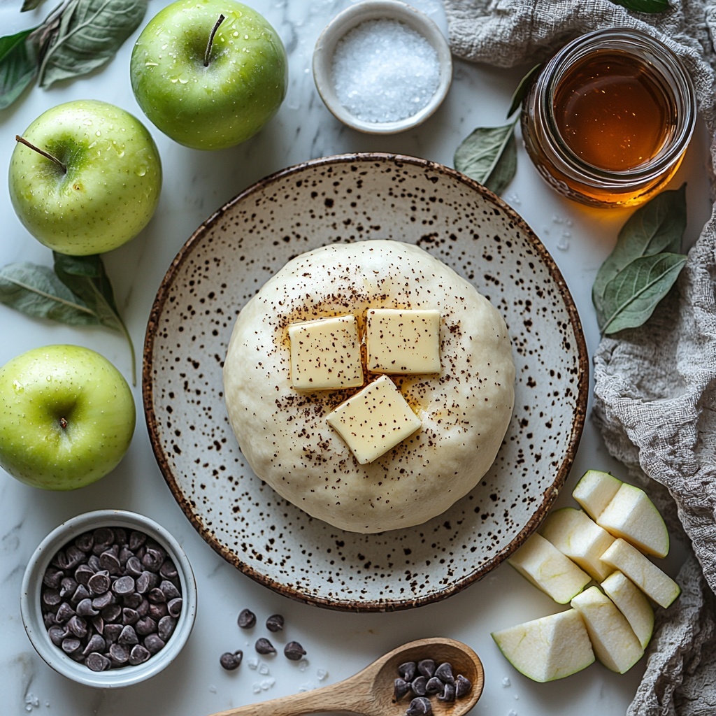 - Assemble Filling: Spread the caramel sauce evenly over the dough’s surface. Sprinkle the cooled apple mixture over the caramel, then scatter the semi-sweet chocolate chips on top.