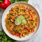 Don’t skip the garnishes! Fresh chopped cilantro, a handful of roasted peanuts, and zingy lime wedges really elevate this Chicken Pad Thai Recipe. They add fresh herbal brightness, delightful crunch, and a bright citrusy burst to each bite, making every forkful exciting.