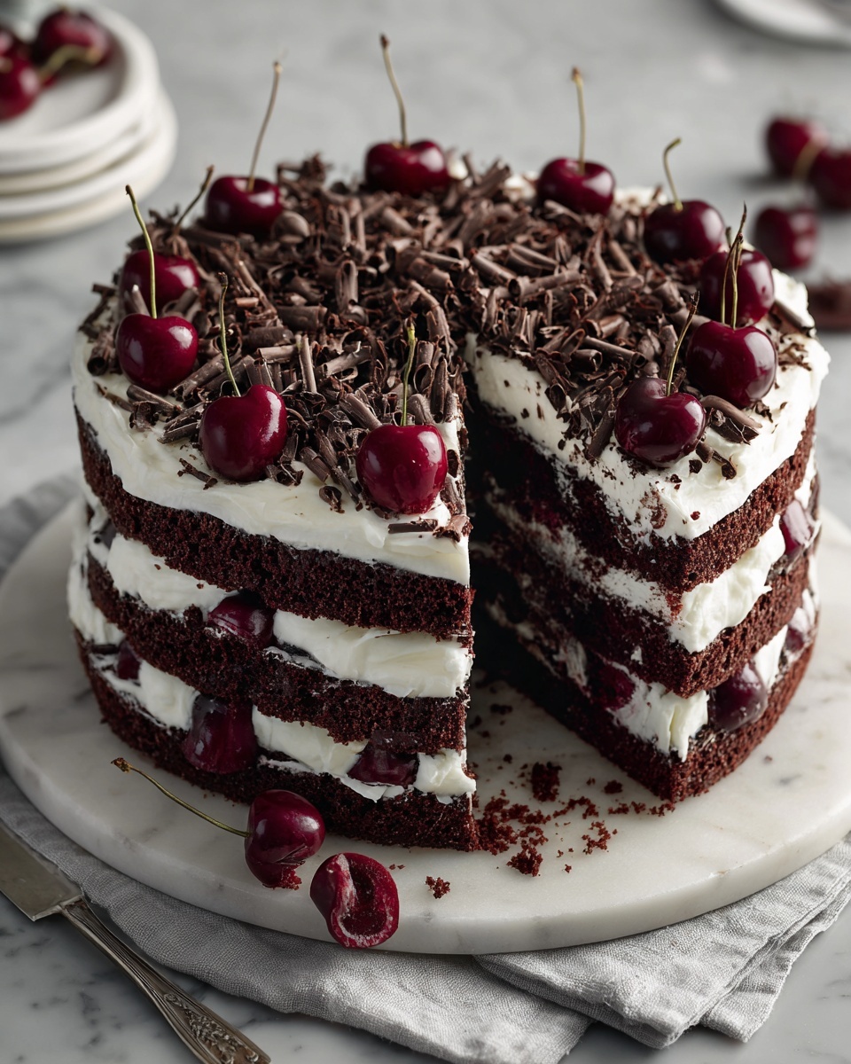 Sprinkle chocolate shavings or curls across the top and garnish with fresh cherries for that stunning, classic look that makes this dessert hard to resist.