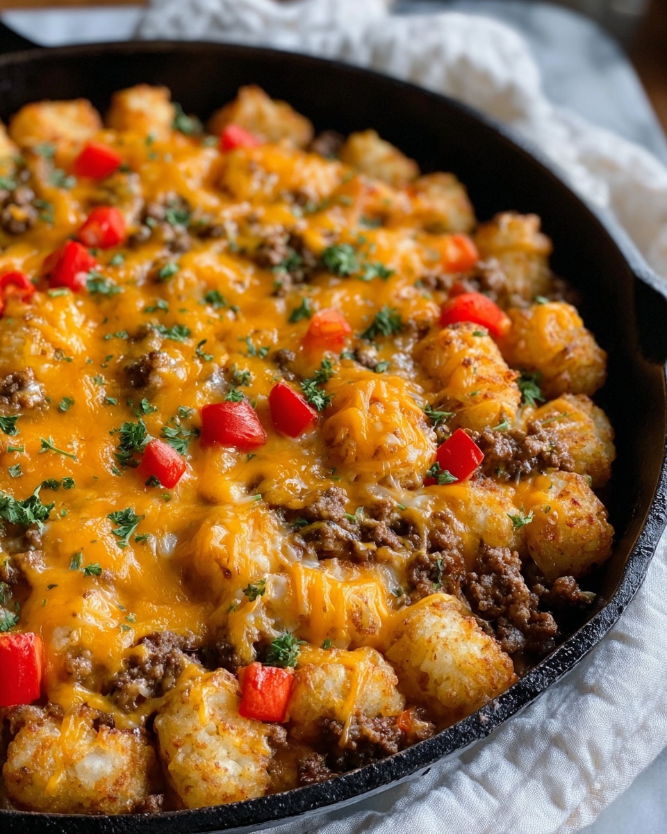 Reheat individual servings in the microwave or warm the entire casserole in a 350°F oven until heated through and the tater tots regain some of their crispy texture. Adding a little extra shredded cheese on top before reheating can make the dish feel fresh and exciting again.