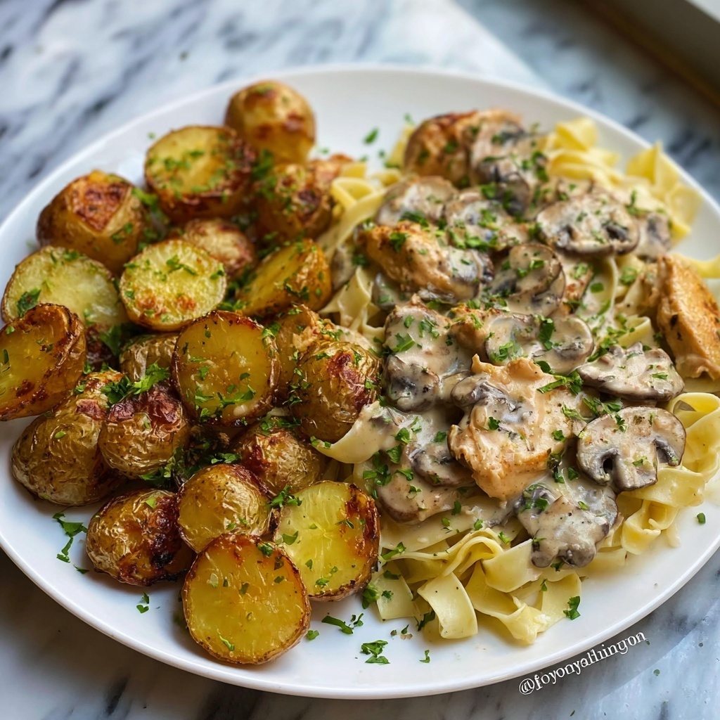 How to Make Creamy Mushroom Garlic Chicken Alfredo with Hot Honey Roasted Potatoes Recipe