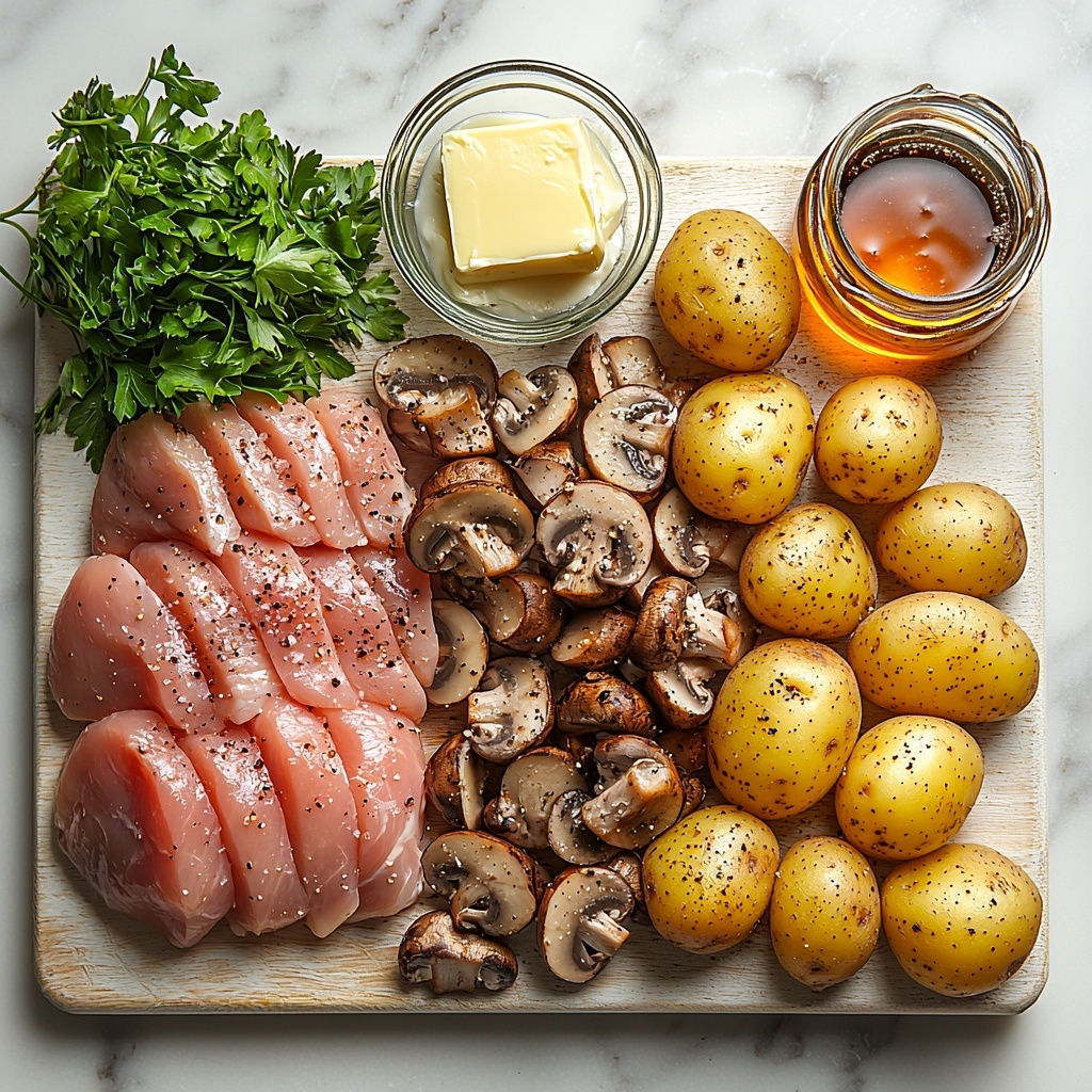 The beauty of the Creamy Mushroom Garlic Chicken Alfredo with Hot Honey Roasted Potatoes Recipe lies in its simple yet thoughtfully chosen ingredients. Each component plays a crucial role, from the creamy texture of the Alfredo sauce to the sweet-spicy kick on the potatoes. Here’s what you’ll need to create this tasty masterpiece: