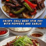 A flavorful and crispy stir-fried beef dish that combines tender marinated beef coated in cornstarch and fried to a golden crisp, then tossed with colorful bell peppers, onions, and spicy red chillies in a savory Asian-inspired sauce.