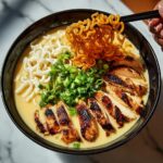 This Fiery Chicken Ramen with Creamy Garlic Sauce is a flavorful and comforting dish that combines spicy, tender seared chicken thighs with rich garlic cream sauce, savory broth, and tender ramen noodles. Perfectly balanced with a hint of chili heat and garnished with fresh green onions, this recipe offers a delicious twist on traditional ramen, ready in just 40 minutes.