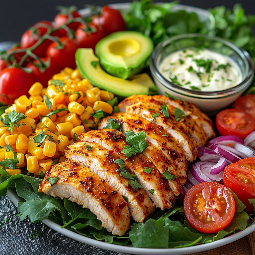 - Assemble the salad: In a large mixing bowl, combine mixed greens, sliced red and yellow bell peppers, red onion, cherry tomatoes, avocado slices, corn kernels, chopped cilantro, and green onions. Add the sliced chicken on top.