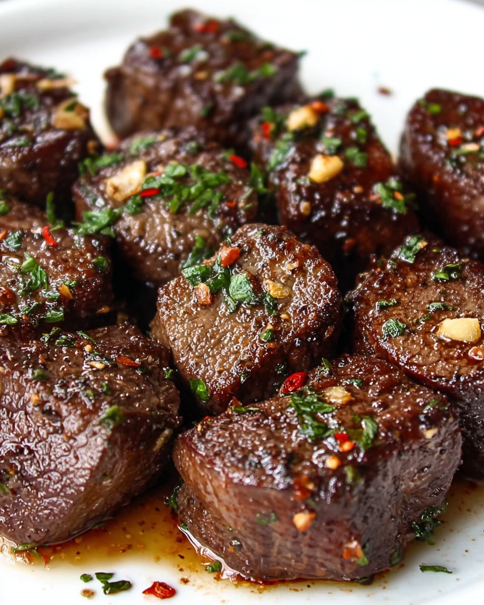 Transfer your sizzling garlic steak bites to a serving dish, sprinkle with freshly chopped parsley for a burst of color and freshness, and present with lemon wedges on the side. A quick squeeze of lemon juice right before eating adds a bright contrast to the rich, savory flavors.