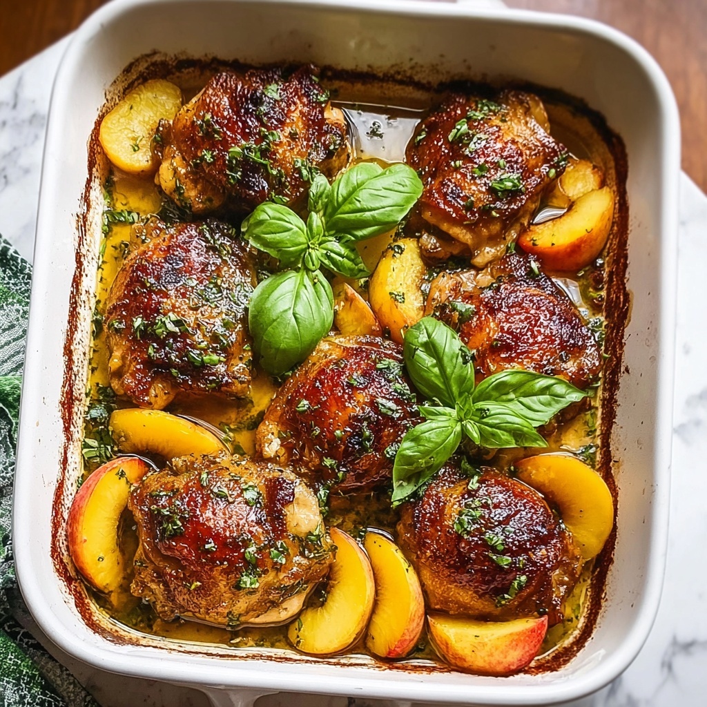 After baking, layer the sliced peaches over the chicken and switch the oven to broil. Let the peaches soften and caramelize for 3 to 5 minutes, adding a tender, juicy sweetness that is absolutely irresistible.