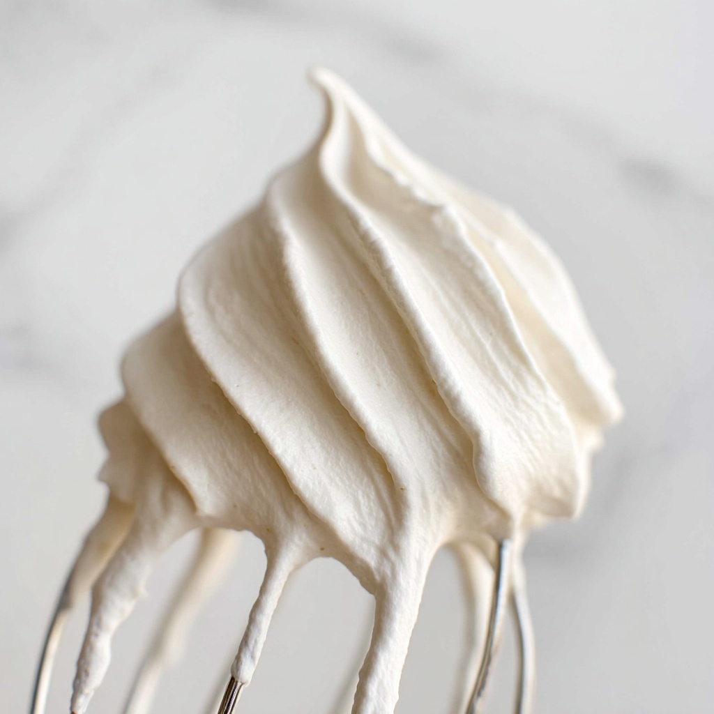This is where the magic happens! After 2 to 3 minutes of whipping, your cream will look thick, smooth, and full of life. Test it by flipping the beater: if the whipped cream holds a gentle peak without collapsing immediately, you’re golden. Your whipped cream should feel light and airy but not runny or grainy. Perfectly smooth and fluffy—just like a little cloud.