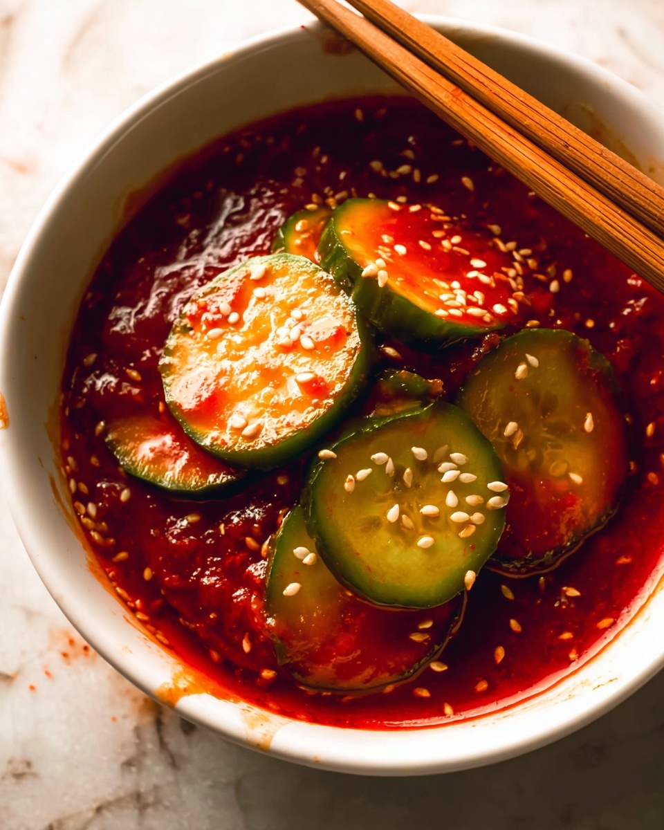 When you’re ready to serve, transfer your Korean Cucumber Salad Recipe to a beautiful bowl or platter, and don’t forget to sprinkle white sesame seeds on top. These little seeds add that perfect nutty crunch and a lovely visual touch, inviting everyone to dig right in and enjoy the fresh, flavorful experience.