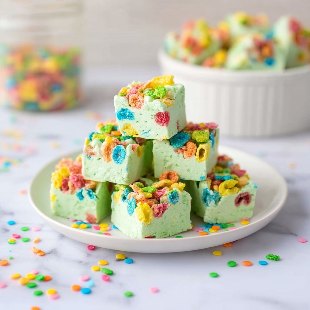 For a little extra wow factor, sprinkle some additional crushed Lucky Charms on top just before serving. You might also add a light dusting of powdered sugar for a subtle snowy effect that looks delightful on the green fudge.