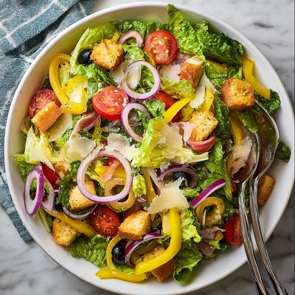 The dressing is the star here, so don’t rush it. In a small bowl or jar, whisk together the red wine vinegar, Dijon mustard, dried oregano, Italian seasoning, crushed red pepper flakes, sugar, salt, and pepper. Slowly drizzle in the extra-virgin olive oil while whisking continuously until the dressing is thick and creamy. Taste and adjust seasoning if necessary. Pour the dressing over the salad just before serving, then toss gently to evenly coat every leaf and topping.