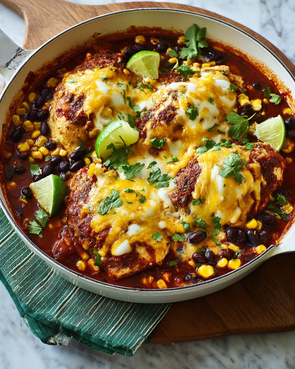 For a casual gathering, serve the chicken family-style directly from the baking dish on a colorful platter surrounded by bowls of garnishes and sides. For something more elegant, plate each breast individually, topped with the bean and corn mixture, melted cheese, and festive garnishes artistically arranged to wow your guests visually as well as in taste.