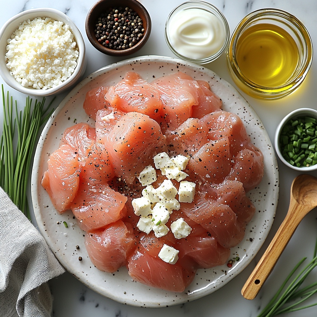 - Prepare the sauce: Stir in the heavy cream, fresh lemon juice, crumbled feta cheese, and half of the chopped chives. Cook the sauce until it thickens slightly, around 2-3 minutes, creating a creamy, tangy base for the chicken.