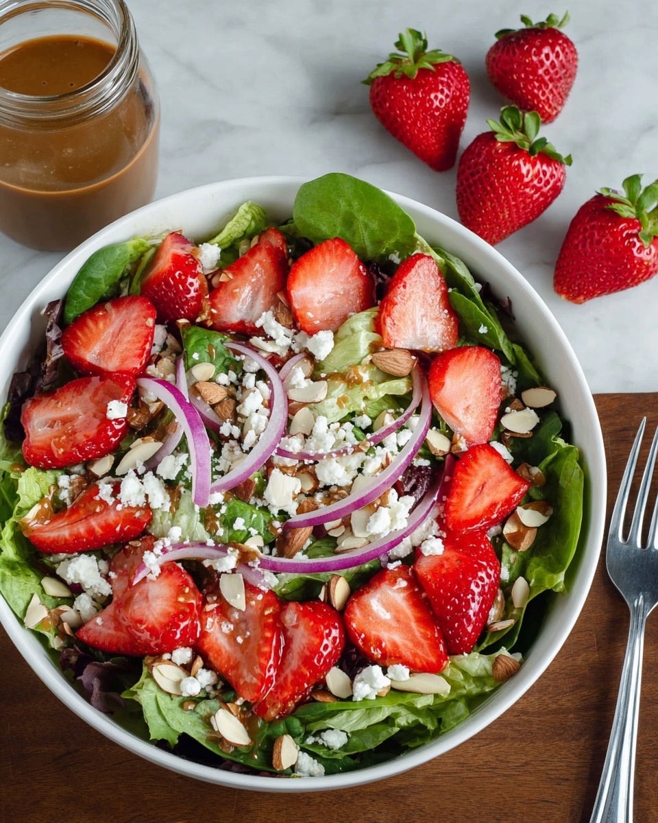 Lay your spring mix greens in a large serving bowl. Sprinkle over the sliced strawberries, thin red onion slices, toasted almonds, and crumbled feta cheese. The colors alone make the salad vibrant and inviting, while the textures create a delightful mix that keeps every forkful exciting.