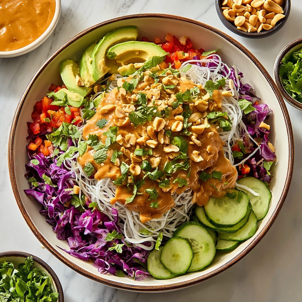 - Combine: In a large bowl, toss together the shredded cabbage, grated carrots, diced bell peppers, sliced cucumber, chopped green onions, and chopped cilantro. Pour half of the prepared peanut dressing over the vegetables and mix thoroughly until all are well coated.