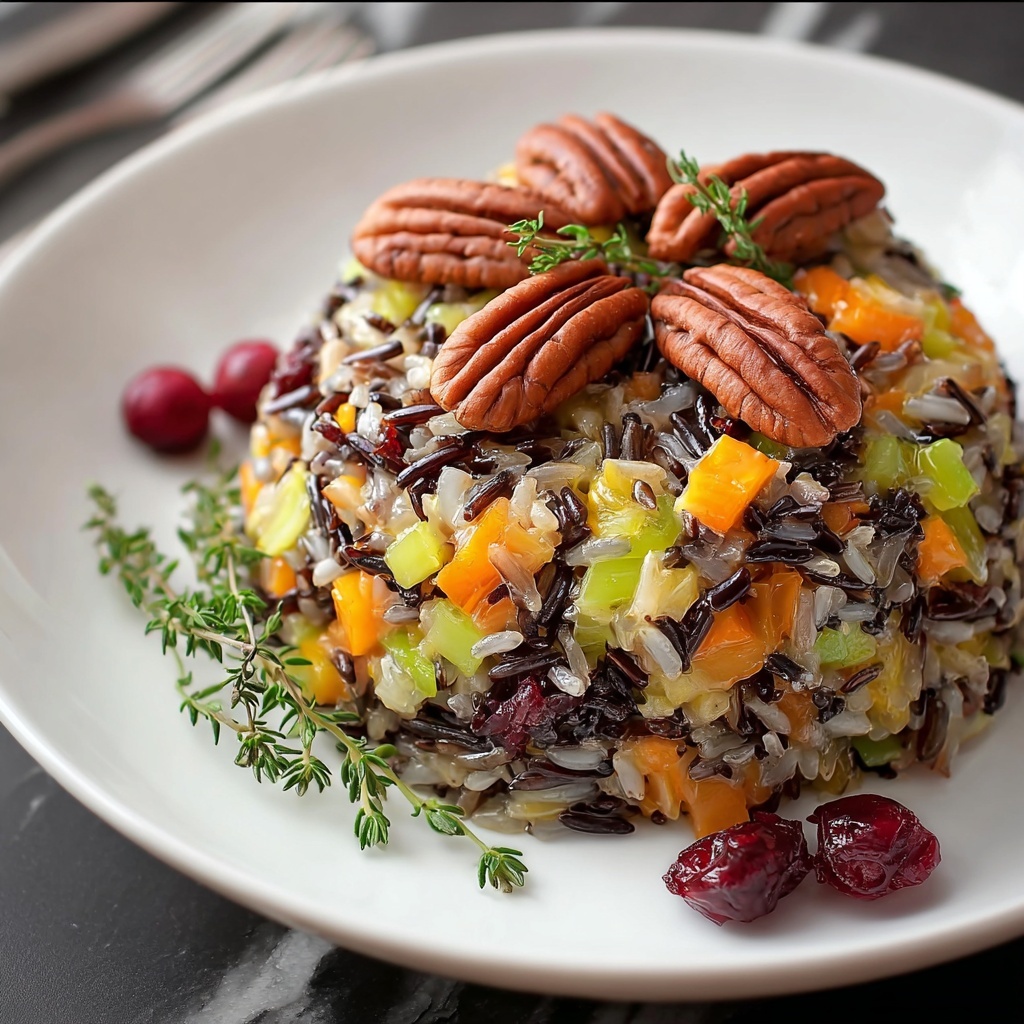 A flavorful and hearty Thanksgiving Wild Rice dish featuring tender wild rice simmered in broth, combined with sautéed vegetables, dried cranberries, and toasted pecans for a festive side perfect for holiday meals.